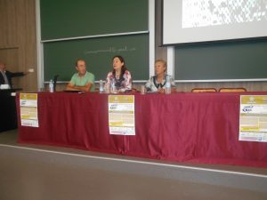 Momento de los testimonios de los usuarios. A la izquierda Jesús Barba, a la derecha, Ana Ibáñez y en el centro Mª TRinidad Rodríguez, psicóloga de APAEX
